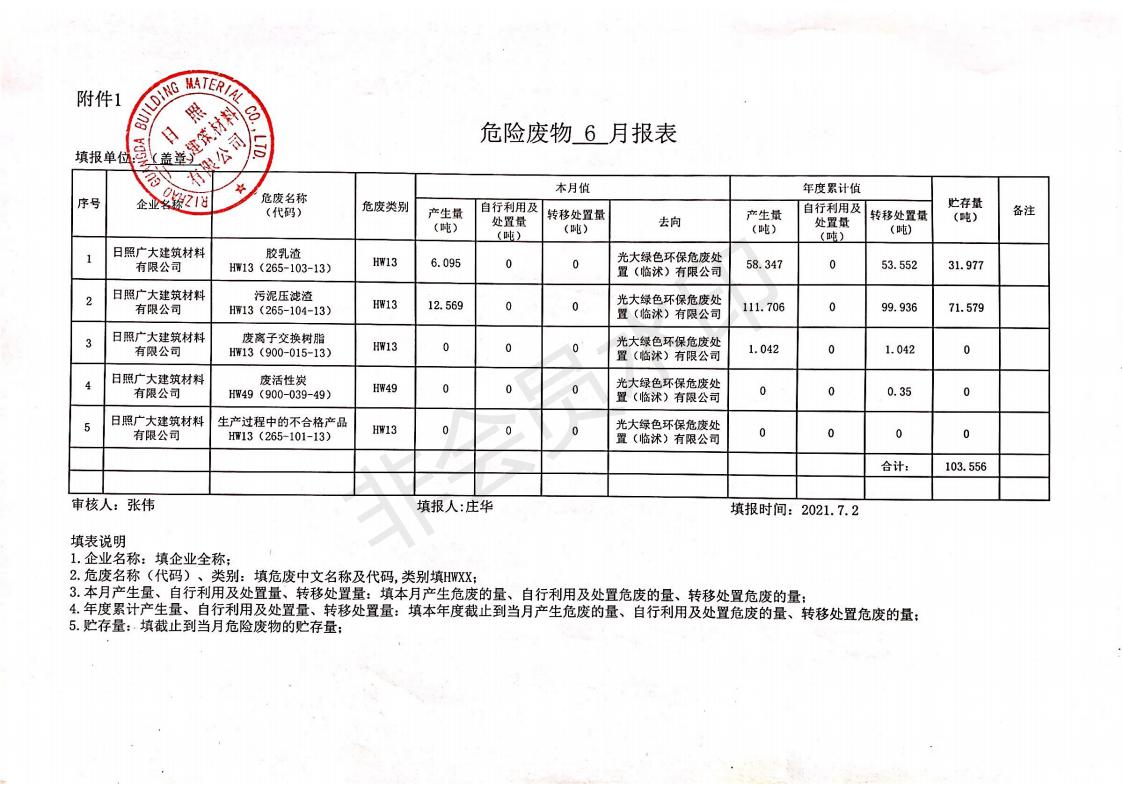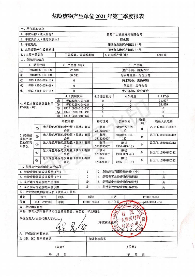 日照廣大建筑材料有限公司2021年04月~06月、第二季度產(chǎn)生報(bào)表